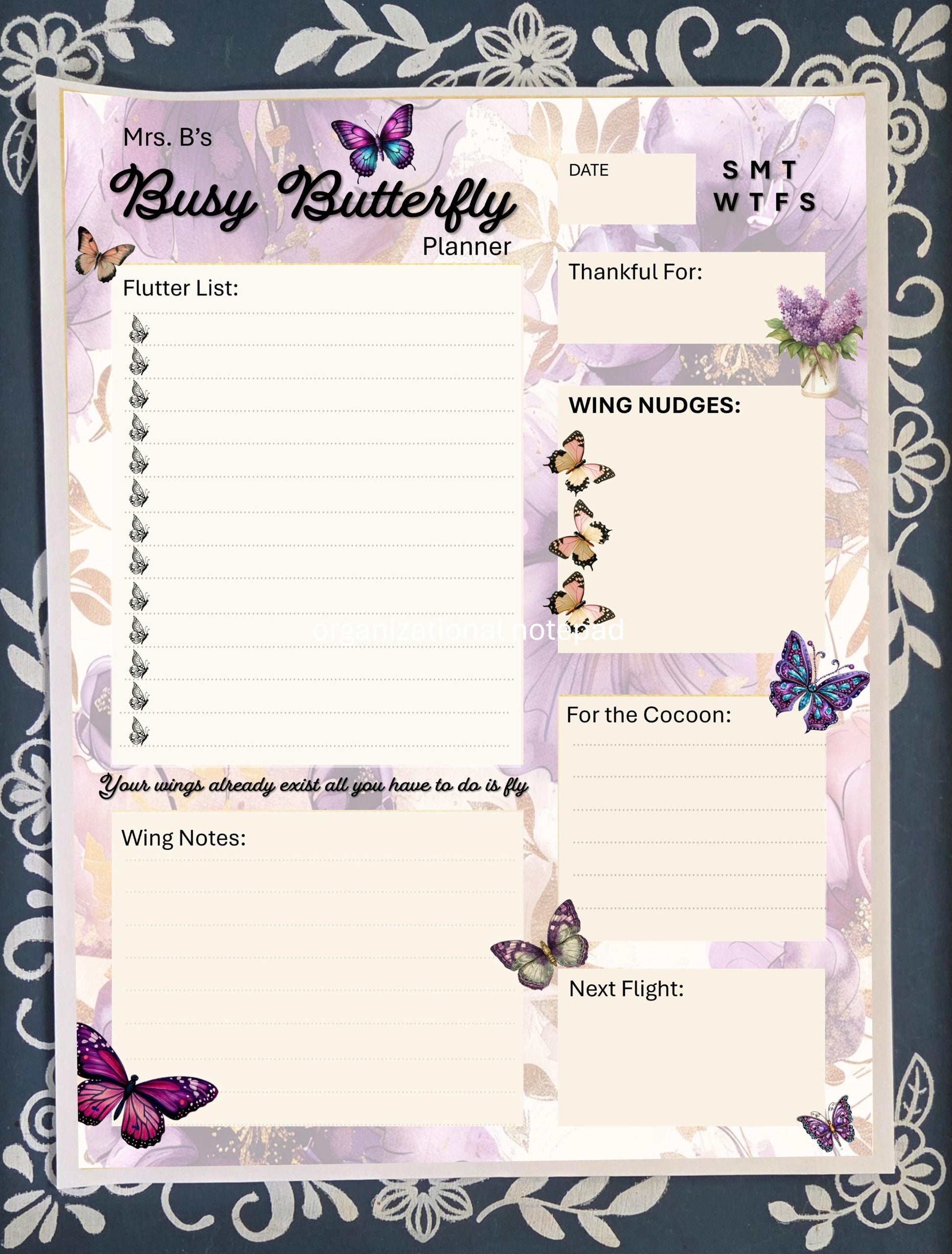 The Busy Butterfly Planner is a beautifully designed 8.5” x 11” tear-away notepad that helps you keep track of your day with ease. Featuring beautiful butterflies and purple accents, this planner pad is both practical and uplifting — perfect for busy butterflies like you.